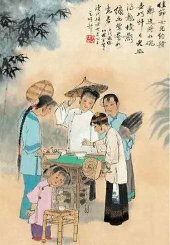 七夕乞巧,這個(gè)節(jié)日起源于漢代,東晉葛洪的《西京雜記》有“漢彩女常以七月七日穿七孔針于開(kāi)襟樓,人俱習(xí)之”的記載,這便是我們于古代文獻(xiàn)中所見(jiàn)到的最早的關(guān)于乞巧的記載。后來(lái)的唐宋詩(shī)詞中,婦女乞巧也被屢屢提及,唐朝王建有詩(shī)說(shuō)“闌珊星斗綴珠光,七夕宮娥乞巧忙”。據(jù)《開(kāi)元天寶遺事》載:唐太宗與妃子每逢七夕在清宮夜宴,宮女們各自乞巧,這一習(xí)俗在民間也經(jīng)久不衰,代代延續(xù)。